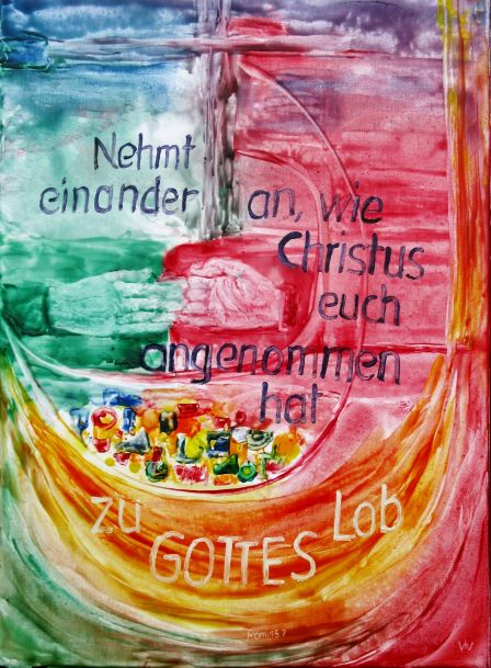 Wer die liebevolle, bedingungslose Annahme durch Jesus Christus persönlich erlebt hat, möchte sie auch andere erfahren lassen. Wer von Christus angenommen ist, bekommt von ihm auch die Kraft, andere anzunehmen. Dieses gegenseitige Annehmen bereichert und fördert unser Miteinander. Dadurch ehren wir Gott, der jeden Menschen nach seinem Bild geschaffen hat. Der große leuchtende Bogen mit seinem strahlenden Gelb umschließt alles zu Gottes Lob.